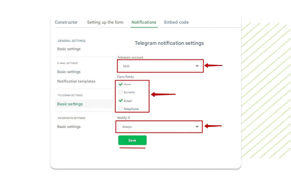 Select the desired account from the list and mark the fields that will be displayed in messages. Set up the notification time: always after submitting the form or by time if the application is not accepted for processing