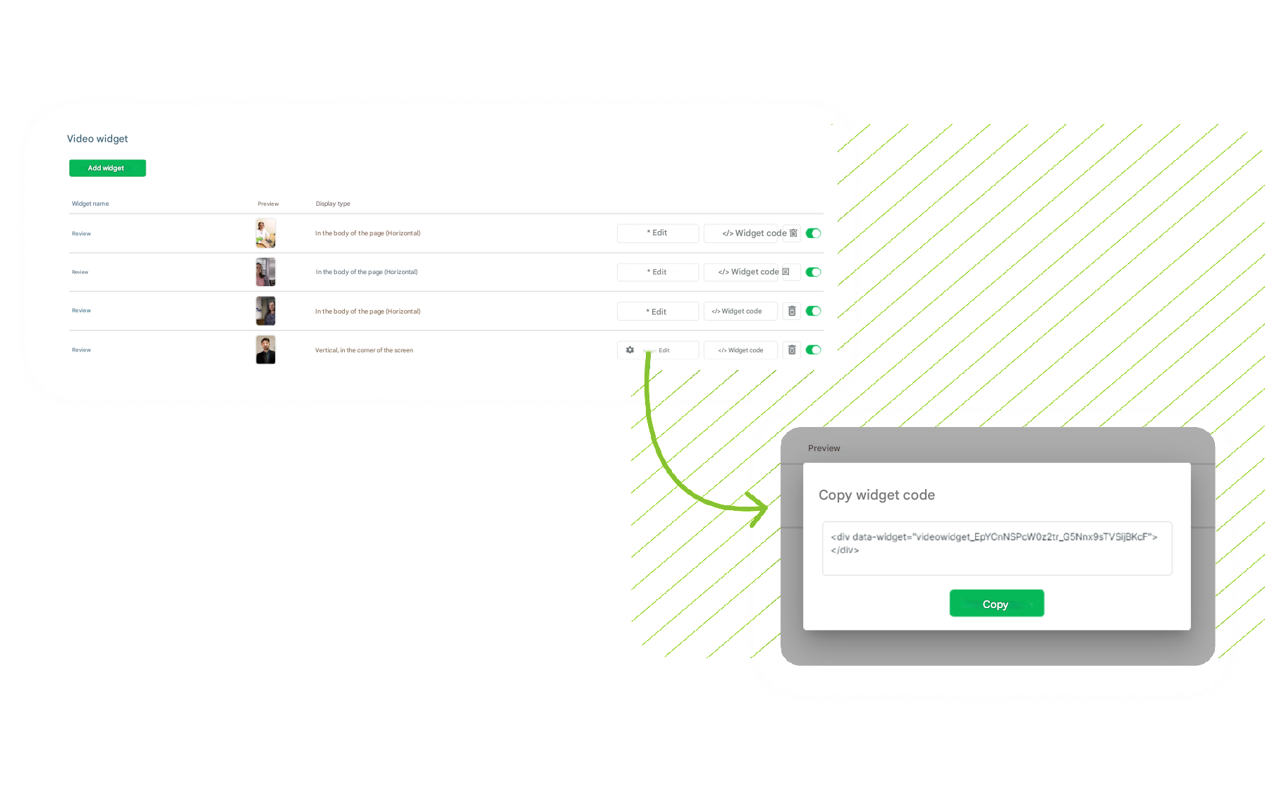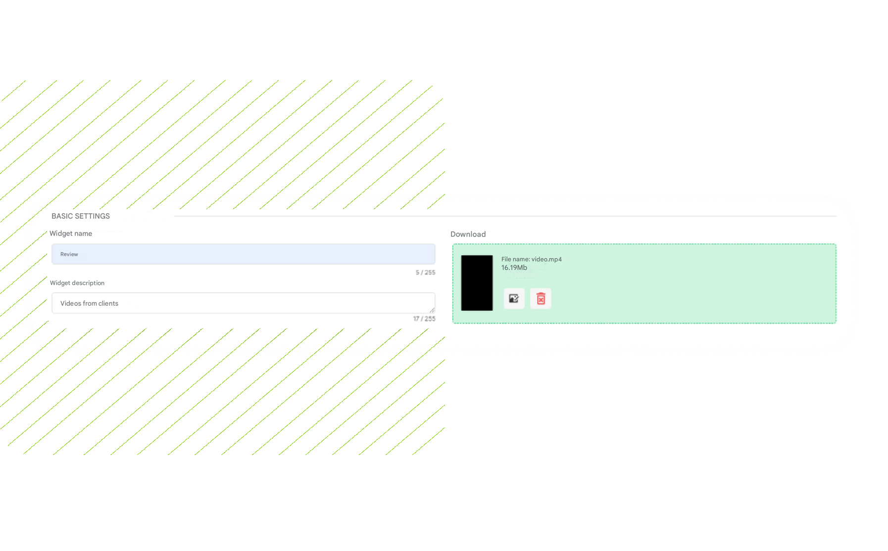 Name the widget and attach a video file in the upload field. If necessary, provide a description of the widgetGo to the Settings tab, open the Embed Code section, copy the script and paste it into the site inside the tag